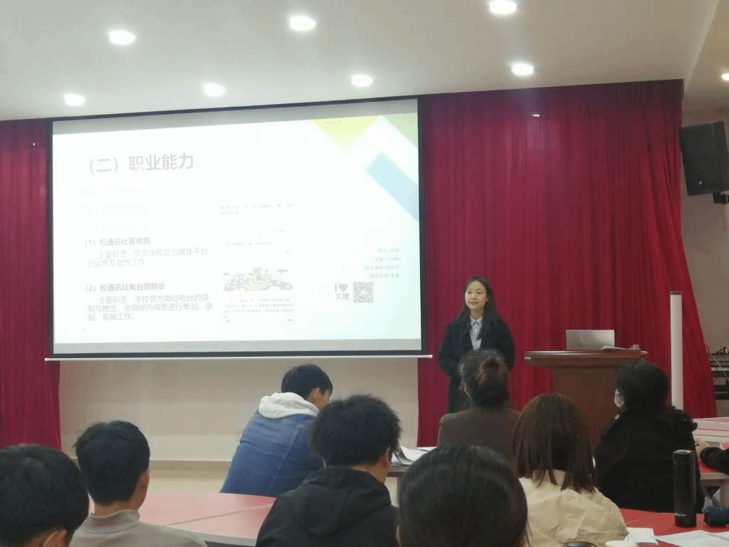 本次比赛共分为选手展示和评委提问两个环节。按照初赛的顺序,所有选手围绕自己的职业规划、实现途径两大主题,分别从自我认知、职业认知、职业决策和职业能力等几个维度进行阐述,向评委老师展示了现阶段的打算和努力方向。