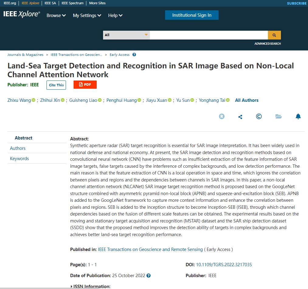 近日,公司电子信息研究生在遥感领域顶级期刊IEEE Transactions on Geoscience and Remote Sensing(JCRQ1,中科院SCI二区Top期刊,IF=8.125)发表研究成果“Land-Sea Target Detection and Recognition in SAR Image Based on Non-Local Channel Attention Network”,硕士研究生王志旭为第一作者,文章通讯作者为辛志慧博士,美加墨世界杯官网为第一完成单位。