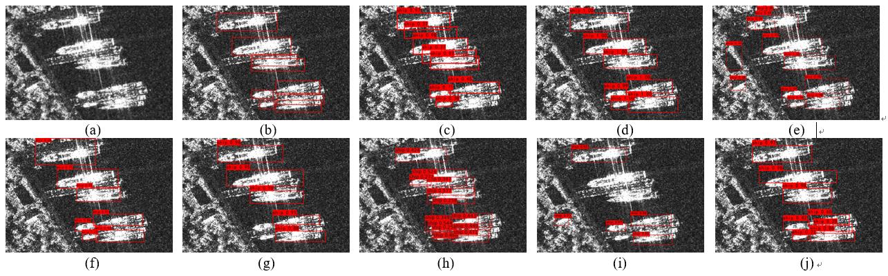 图SAR图像的检测和识别结果.(a)原始图像,(b)目标标签位置,(c) SSD, (d) YOLOv3, (e) Faster-RCNN, (f) YOLOv4, (g) GoogLeNet, (h) FCOS, (i) DETR,(j)本文方法.