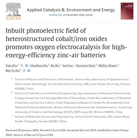近日,公司mjm世界杯官网高层次引进人才朱挺老师课题组在光充锌空电池领域取得重要进展,其题为《Inbuilt photoelectric field of heterostructured cobalt/iron oxides promotes oxygen electrocatalysis for high-energy-efficiency zinc-air batteries》的最新研究成果在催化领域顶刊《Applied Catalysis B: Environment and Energy》上在线发表(期刊最新影响因子:20.2,中科院一区TOP期刊)。美加墨世界杯官网为第一完成单位,朱挺老师为第一作者兼通讯作者,华中科技大学夏宝玉教授为共同通讯作者。据悉,这是美加墨世界杯官网首次以第一单位在该学术期刊发表研究论文。
