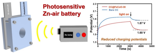 利用光能促进电化学储能是近些年新兴的研究热点,而如何促进光生载流子的分离与迁移并高效运用于储能器件是关键挑战之一。朱挺老师带领的课题组研制了一种新型Fe2O3/Co3O4的光电双功能复合材料,通过异质结构筑、能带结构重整及氧缺陷调控等策略加强了材料表面的光电压(最大光电压可达44 kV/m),以此加速光生电荷的分离、迁移与存储,并采用理论计算和实验表征等手段对光辅助充电机制进行了深入探究。该Fe2O3/Co3O4作为光电极用于锌空电池时,器件能量效率可从64%提升至78%,且比容量从645.2 mAh/g增加到712.3 mAh/g,显著提升了光能在储能过程中的利用效率。据介绍,该研究成果得到了云南省光电信息技术重点实验室人员和设备的支持,并得到了国家自然科学基金项目(52263028)、云南省自然科学基金(202301AT070059)及昆明市春城计划(2022SCP005)等项目经费的资助。