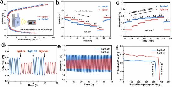 图3光充锌空电池电化学性能对比图
